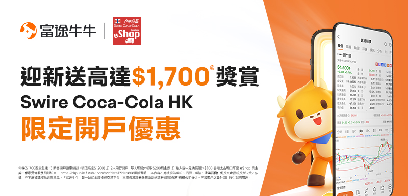 Swire Coca-Cola HK客戶開戶額外$300 eShop 現金券﹗ 即日起至8月31日, 富途新客戶憑兌換碼「FTSWIRE」全新開戶並完成指定條件可享高達HK$1,700獎賞。 開戶存入資金HK$10,000並留存30/60/90日可享六選一獎賞: 匯豐控股 (0005.HK) 13股 或 台積電 (NYSE: TSM) 1股 或 HK$800 超市禮券 或 HK$1,200 理財現金券 或 港股Lv.2 串流報價 (4個月) 或 HK$1200 期權優惠 (美股期權佣金卡88美元,美股期權深度行情卡6個月,全美綜合報價6個月) 優惠受條款及細則約束: https://hkpublic.futuhk.com/act/detail?id=5868 立即開戶: https://futunn.onelink.me/fzPs/w4z1l0x5