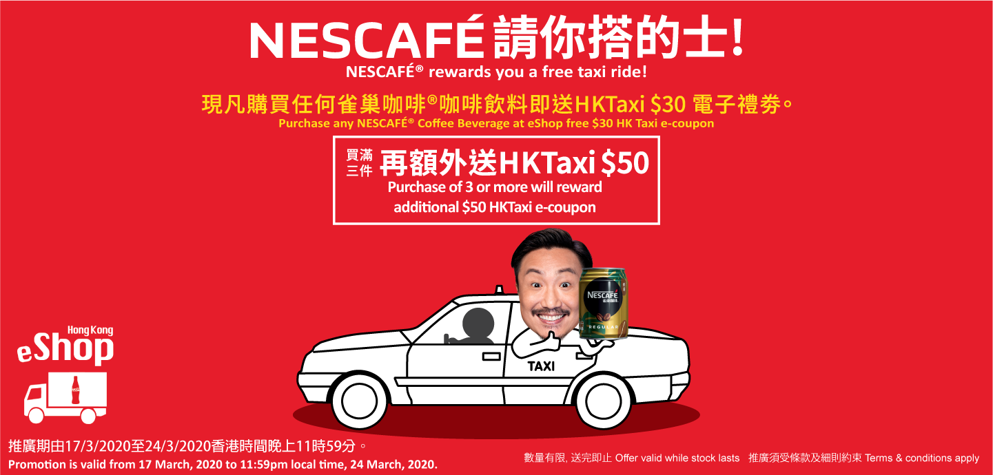 - Purchase of 1 – 2 packs or cases of NESCAFÉ® Coffee Beverage will free $30 HK Taxi e-coupon. Purchase of 3 or more NESCAFÉ® Coffee Beverage will free an additional $50 HKTaxi e-coupon (i.e. total $80 HKTaxi coupon).